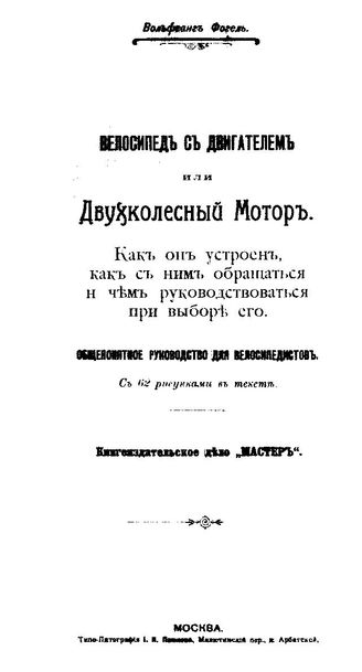 Фогель В. Велосипед с двигателем или двухколесный мотор. Как он устроен, как с ним обращаться и чем руководствоваться при выборе его. - М., 1905.