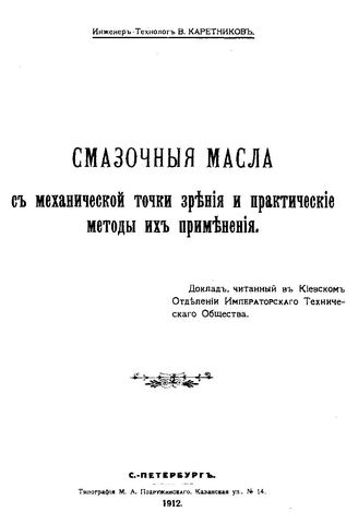 Каретников В. Смазочные масла с механической точки зрения и практические методы их применения. - СПб., 1912.