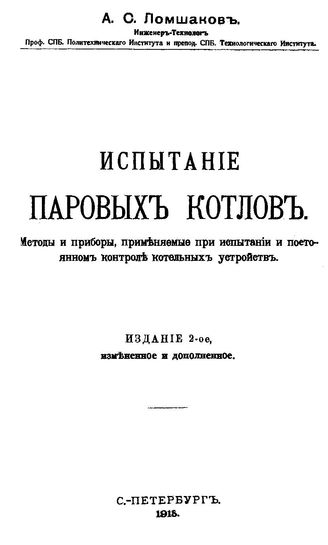 Ломшаков А.С. Испытание паровых котлов. Методы и приборы, применяемые при испытании и постоянном контроле котельных устройств / А. С. Ломшаков, 1913. - 523 с.