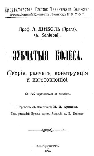 Шибель А. Зубчатые колеса. Теория, расчет, конструкция и изготовление / А. Шибель: пер. с нем. М. И. Аронова, под ред. А. В. Панкина, 1913. - 95 с.