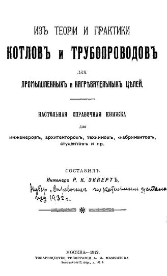 Эккерт Р.К. Из теории и практики котлов и трубопроводов для промышленных и нагревательных целей. - М., 1912.