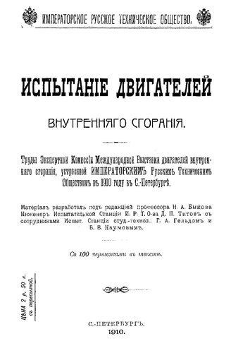 Испытание двигателей внутреннего сгорания : тр. Эксперт. комис. Междунар. выставки двигателей внутреннего сгорания, устроен. Императорским рус. техн. о-вом в 1910 г. в С.-Петербурге, 1910. - 152 с.