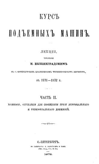 Курс подъемных машин : лекции / И. Вышнеградский. Ч. 1 : О частях машин, служащих для подвешивания грузов. Простейшие переносные подъемные машины, Ч. 2. Машины, служащие для сообщения грузу вертикального и горизонтального движения, 18. - 135 II, 219, II с.