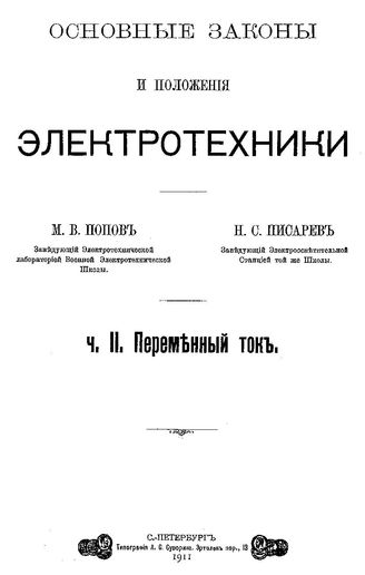 Основные законы и положения электротехники М. В. Попов, Н. С. Писарев. Ч. 2 : Переменный ток. - СПб., 1911.