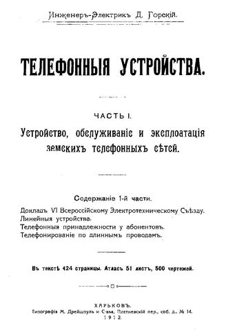 Телефонные устройства / Д. Горский. Ч. 1 : Устройство, обслуживание и эксплуатация земских телефонных сетей, 1912. - 424 424 с.