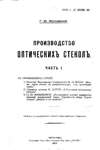 Производство оптических стекол Г. Ю. Жуковский. Ч. 1. - Петроград, 1918.