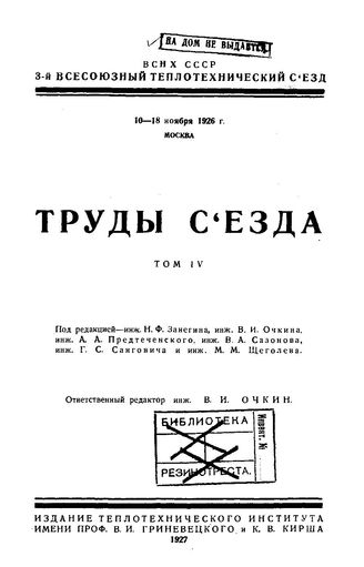 Труды съезда Всесоюзный теплотехнический съезд (3 ; 1926 ; Москва). Т. 4. - М., 1927.