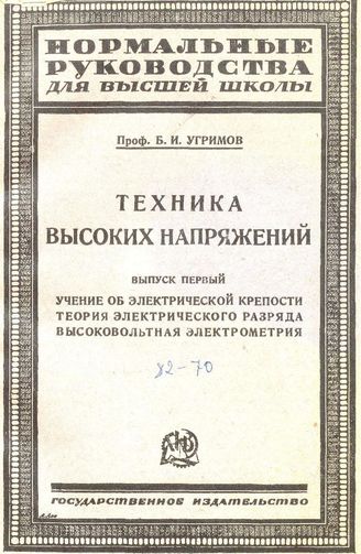 Техника высоких напряжений : рук. для высш. техн. учеб. заведений / Б. И. Угримов. - (Нормальные руководства для высшей школы). Вып. 2 : Высоковольтные изоляторы, 1924. - 151 с.