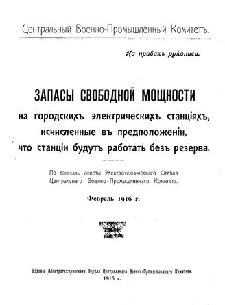 Запасы свободной мощности на городских электрических станциях, исчисленные в предположении, что станции будут работать без резерва : по данным анкеты Электротехн. отд. Центр. воен.-пром. ком., 1916. - 35 с.