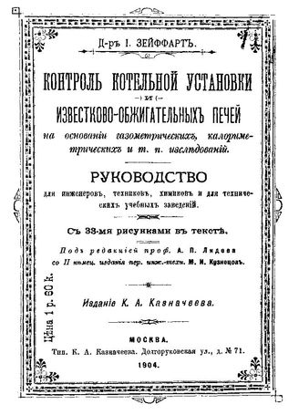 Зейффарт И. Контроль котельной установки и известково-обжигательных печей на основании газометрических, калориметрических и.т.п. исследований. - М., 1904.
