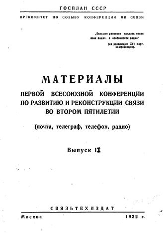 Материалы Первой Всесоюзной конференции по развитию и реконструкции связи во втором пятилетии (почта, телеграф, телефон, радио). Вып. 2. - М., 1932.
