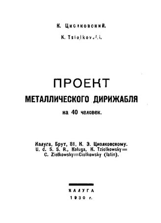 Циолковский К. Э. Проект металлического дирижабля на 40 человек. - Калуга, 1930.