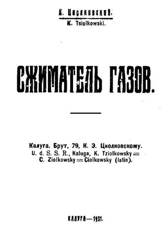 Циолковский К. Э. Сжиматель газов. - Калуга, 1931.